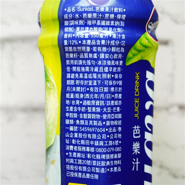 「Sunkist 芭樂果汁飲料」の基本情報(原材料/栄養成分表示など)