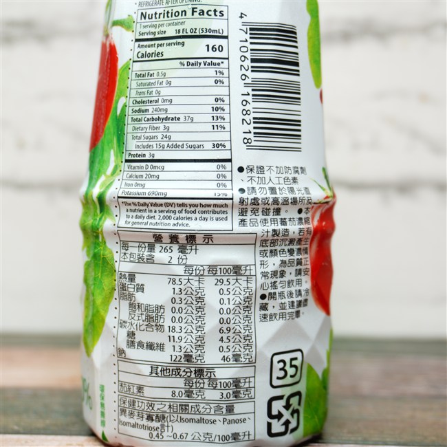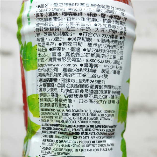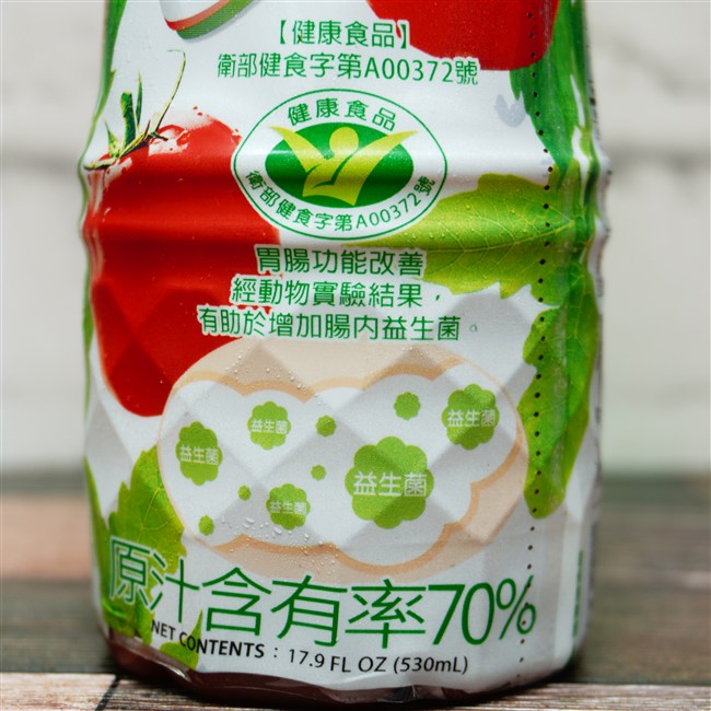 愛之味(AGV)が販売するロングセラーのトマトジュース。台湾の衛生福利部から「健康食品」としての認証(衛部健食字第A00372號)を受けており、「胃腸機能の改善に役立つ」と表示されています。リコピンや食物繊維、オリゴ糖が含まれている点も特徴です。